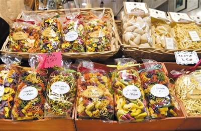 这是4月14日在意大利佛罗伦萨中央市场拍摄的意大利面食。