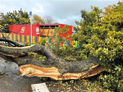 5月20日,在新西兰首都惠灵顿附近小镇列文,被龙卷风刮倒的大树阻塞道路。