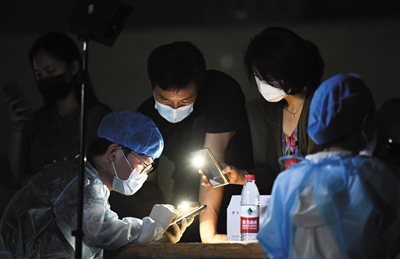 5月20日,在天津市南开区时代奥城社区核酸检测点,工作人员为进行核酸采样的市民登记信息。