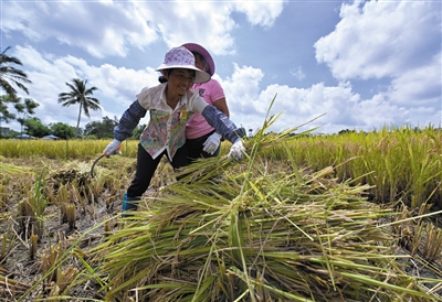 小满时节,海南省海口市琼山区红旗镇的“琼山福稻”迎来丰收,农户们趁着晴好天气开镰收割。近年来,海南重点发展热带高效农业,打造农业品牌,带动农民增收,助力乡村振兴。
