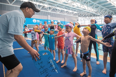 ▲5月21日,小朋友们在志愿者的带领下练习落水时的自救姿势。
