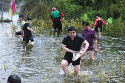 5月21日,游客在张堰村参加“茭白生活节”的趣味摸鱼活动。