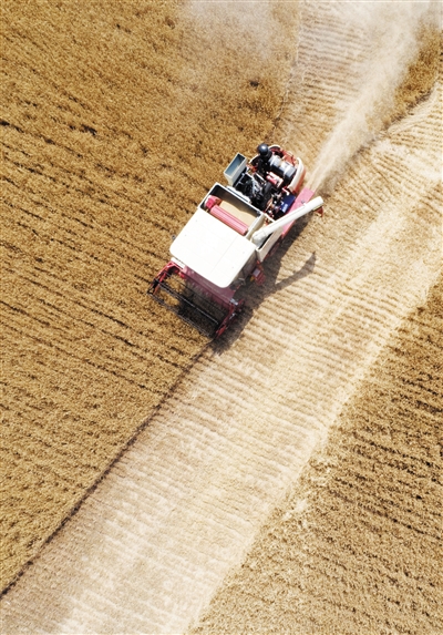 时下,被誉为“鲁南粮仓”的山东省临沂市郯城县小麦陆续进入收获期,当地农民抓紧抢收晾晒,确保颗粒归仓。