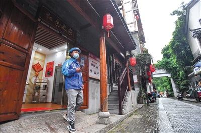 5月26日,一名外卖员休息后走出长沙市天心区“快递外卖小哥红色之家”天心阁站。