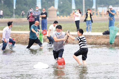 5月28日,在江苏淮安洪泽区岔河镇其虎村,村民和游客在插秧节上比赛摸鱼。