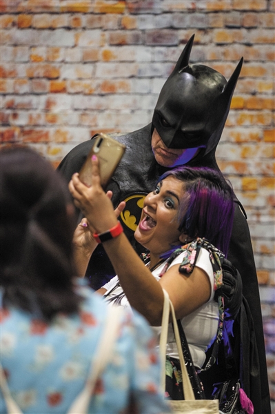 5月27日,在英国伦敦,一名女子与角色扮演者在动漫展上自拍。