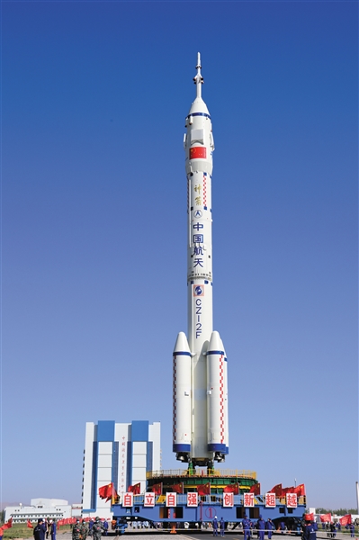 当日,神舟十四号载人飞船与长征二号F遥十四运载火箭组合体已转运至发射区。