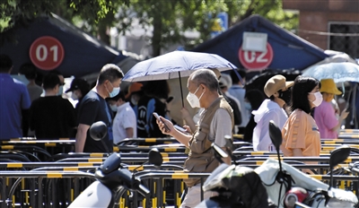 5月29日,北京朝阳区青年路一带的居民在进行常态化核酸检测。