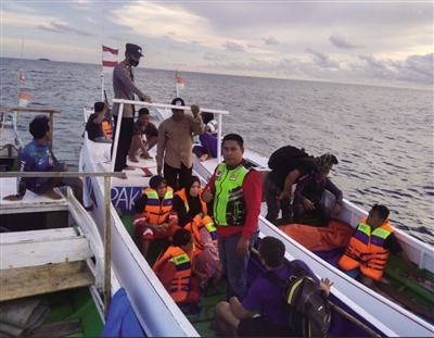 这张印度尼西亚国家搜救局提供的照片显示,5月28日,部分落水人员在南苏拉威西省附近海域获救。