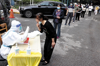 5月30日,上海市普陀区一居民小区的居民进行核酸采样。
