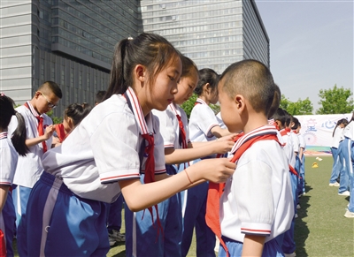 图为北岳小学高年级少先队员给新队员系红领巾,欢迎他们入队。