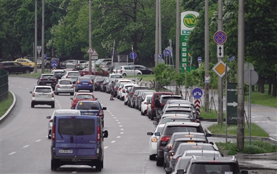 5月30日,在乌克兰基辅市中心一处加油站外,等待加油的车辆排起长龙。