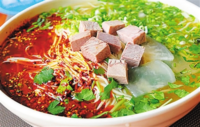 兰州牛肉面不仅光滑爽口、味道鲜美,而且看上去就让人食欲大增,当地人描述它是一红、二绿、三白、四黄、五清,即:辣椒油红,汤上漂着鲜绿的香菜和蒜苗,几片白萝卜夹于红绿之中更显纯白,面条光亮透黄,牛肉汤虽系十几种调料配制却清如白水。此外,兰州牛肉面的面形也很有名堂,有宽达二指的“大宽”、宽达一指多的“二宽”、形如草叶的“韭叶”、细如丝线的“一窝丝”、呈三棱条状的“荞麦棱”,以及“二细”“三细”“细”“毛细”等,顾客可随爱好自行选择。再加上兰州拉面拉抻起来也是奇妙无比,因此兰州牛肉面的声誉一直延续至今,并被中国烹饪协会评为三大中式快餐之一,成为地地道道的“中华第一面”。 (一凡)