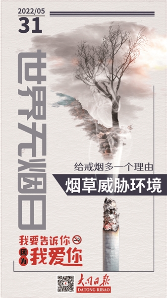 2022年5月31日是第35个“世界无烟日”。今年的主题是“烟草威胁环境”。烟草对地球资源和环境的影响将烟草从个人问题转变为全人类的问题。二手烟中有大约250种有毒物质,其中至少有69种致癌。每年约有60万人因二手烟过早死亡,二手烟甚至可导致婴儿猝死。为自己、为家人、为他人,尽早戒烟,不在公共场所吸烟!