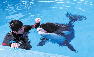 5月31日,在上海海昌海洋公园,小虎鲸在水中与保育员玩耍。