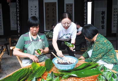 ▶ 6月1日,在湖源乡窈口村的老台门古建筑里,村民和党员志愿者共包灰汤粽。