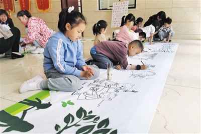 大厅的另一侧是忙得热火朝天的小朋友们,在“彩绘长卷倡环保”主题活动中,孩子们一边聆听着社区工作者讲解地球日的由来、生活中的环保小常识等,一边用彩笔勾勒着自己对美丽地球的无限想象。伴随着老师的讲解,十米长卷上逐渐浮现出“大眼睛地球”“垃圾分类”“保护动物”“植树护绿”等图案,五彩斑斓的颜色表达出孩子们对美好环境、绿色地球的愿望。社区也号召孩子们化身环保小卫士,带动家人从自身做起、从小事做起,争当“保护地球”的代言人。