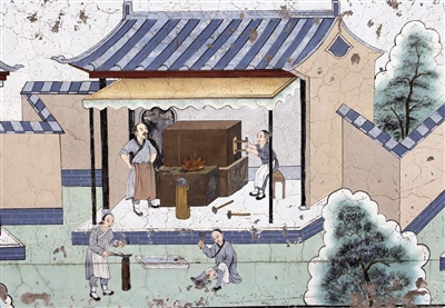 想一睹百工兴业的盛况吗?广灵县城东的水神堂里有壁画描绘。数十幅《百工图》里,可见铁匠铺、香房、染房、饼子铺、豆腐房、剃头房、铸铁铺、毡帽铺、粟粮店、生药店、柳器店、瓷器摊、裱糊局、估衣局、成衣局、首饰铺、书画斋、石匠铺、油匠铺,行业齐全,门类繁多,展现出广灵手工业、商业曾经的喧闹红火。