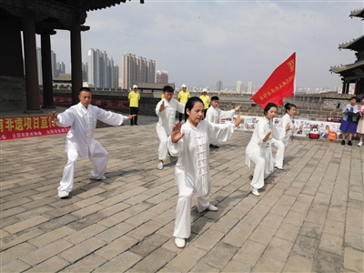 昨日,在南城墙箭楼的大同长城展馆前,来自我市的众多武术爱好者进行了体育类非遗项目的表演与展示。