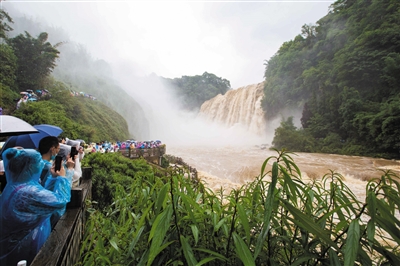 受持续降雨及上游来水影响,位于贵州省安顺市的黄果树瀑布迎来2022年入汛后最大水量。