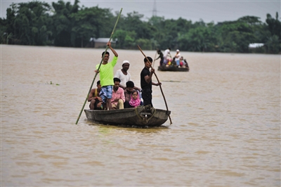 ◀ 6月18日,在印度阿萨姆邦霍杰伊地区一个村庄,受灾村民乘船向安全地带转移。