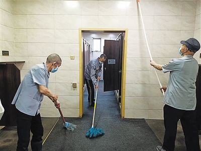 记者昨日在位于大同火车站附近的一处公共卫生间看到,一名保洁员正提着消毒瓶对便池、门把手、洗手台、水龙头等部位进行消毒作业,3名保洁员正在擦拭墙面。据公司负责人介绍,该公司管辖112处公共卫生间,前段时间为所有公共卫生间补齐了防滑垫、冲洗器具、照明设备、灭蝇灯、防蝇帘,维修养护了供排水管、洗手盆、化妆镜、干手器、挂物钩等设施。保洁员每天对坐便器、尿池、洗手盆等进行全方位不间断循环冲洗、消毒,定时喷洒空气清新剂,确保无明显异味。