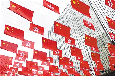 香港九龙尖沙咀的一条街道上挂满中华人民共和国国旗和香港特别行政区区旗(6月20日摄)。