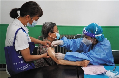 6月20日,在学院路街道六道口社区的一处新冠疫苗临时接种点,医护人员(右)为小区居民接种新冠疫苗。