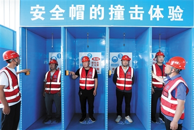 ▶6月22日,中铁建工第二建设有限公司即墨中心城项目的建筑工人在进行安全帽撞击项目体验。