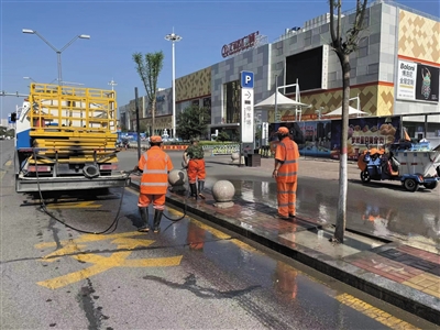 为进一步美化城市环境,全面提高路面洁净度,连日来,市新城环境公司的环卫工人战高温,对主要道路开展油污大清洗行动,被冲洗路面和生活垃圾设施的污垢渐渐减少,藏匿在地砖缝隙里的细小垃圾也被清理出来,原本“灰头土脸”的路面变得洁净如新,营造良好的人居环境,让市民干干净净出行。 图为环卫工清洗南环东路路面。