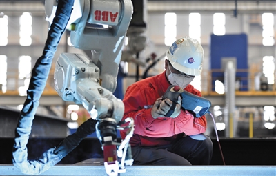 ▲6月26日,在海油工程天津智能化制造基地结构预制车间内,工作人员在操作焊接机器人。