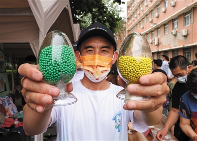 6月26日,在第四届农科开放日上,工作人员展示带彩色包衣的种子。