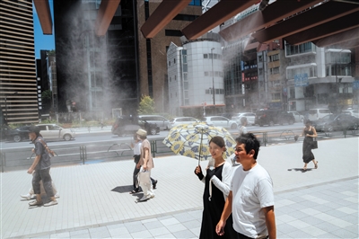 6月26日,行人走过日本街头的喷水消暑装置。