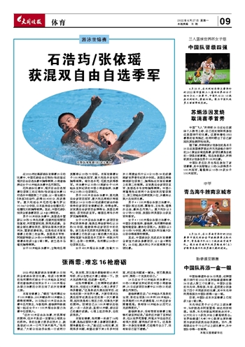 花样游泳比赛中,混双自由自选预赛位居第三的石浩玙/张依瑶在决赛12对选手中倒数第二个出场,以一套主题为《侠客》的动作,获得88.4000分,收获季军。意大利组合米尼西尼/鲁杰罗以90.9667分夺冠,日本姐弟组合佐藤友花/佐藤阳太郎摘得银牌。至此,中国花游队结束全部参赛项目,以4金2铜收官。