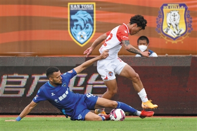 6月26日,在江苏南京举行的2022赛季中国足球协会甲级联赛第五轮比赛中,青岛海牛队以1∶0战胜南京城市队。图为南京城市队球员维迪奇(左)铲断青岛海牛队球员谢文能的进攻。