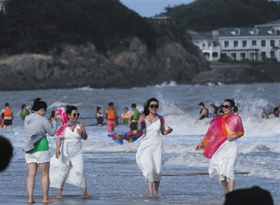 游客们在朱家尖南沙景区的沙滩上游玩(6月28日摄)。