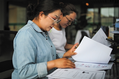 “格桑花开”大学生就业创业特训营学员、西藏藏建科技股份有限公司职员次仁琼达(左)在工作(2022年6月24日摄)。