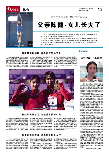 在陈芋汐遇到困难或是意志消沉的时候,作为父亲和启蒙教练,陈健都会给予关怀、帮助与鼓励。“孩子已经长大了,有了自己的目标与方向。作为家长,我们能做的只是陪伴,哪怕不在她身边,也让她感觉到父母的爱。或许对她来讲,陪伴就是最好的鼓励吧!”
