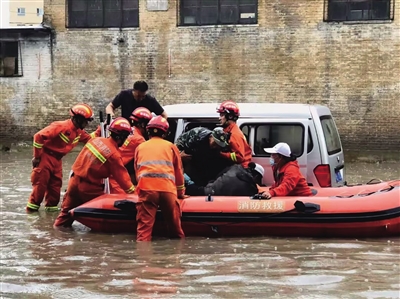 本报讯 (记者 龙中华) 连日来,受强对流天气影响,我市各县区出现不同程度的强降雨,造成多人被困。各地消防救援队伍闻“汛”而动,全力投入抢险救援,在风雨中守护人民生命财产安全。 6月28日15时许,平城区鑫苑小区附近,暴雨过后路面积水较深,一辆载有5名乘客的面包车抛锚。平城区消防救援大队接警后,将皮划艇推向被困车辆实施营救。“来,踩我肩上!”“慢慢来,小心磕伤。”因橡皮艇与车窗存在一定高度差,5名乘客分别踩着救援人员的肩膀,从车辆前后门位置转移到皮划艇上,之后被运送至安全地带。