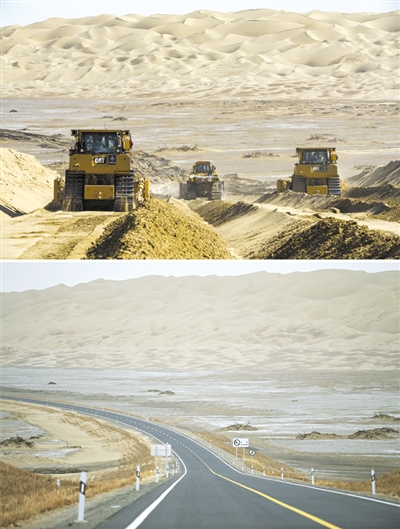 “我们解决了沙漠地区风积沙路基填筑关键技术难题,这样的工艺充分利用了沙漠中现有的材料,使修路成本降低不少。”中国交建新疆尉且沙漠公路项目经理王云飞说。