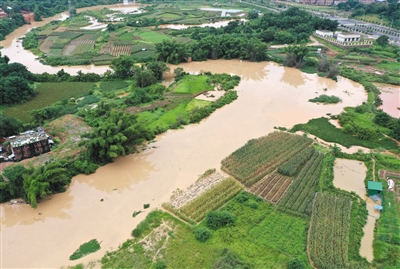 ◀这是7月4日拍摄的广西南宁市那平江水位上涨情况(无人机照片)。