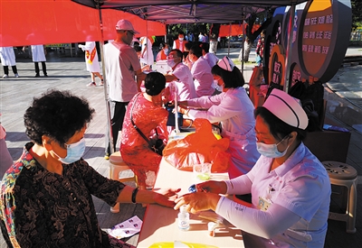 本报讯 (记者 高燕) “快来吧,今天还有义诊。我问了,不仅有各科专家,还能测血糖、做心电图和B超呢……”6日,看到市二医院肿瘤医院的医护人员又在大同公园东门附近义诊,晨练的李阿姨连忙打电话通知邻居。据了解,这是市委卫健工委牵头组织的大型义诊周活动的一幕。