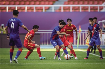 7月7日,在辽宁大连举行的2022赛季中国足球协会超级联赛第九轮比赛中,上海申花队以1∶0战胜河北队。图为上海申花队球员钱杰给(左三)在比赛中控球。