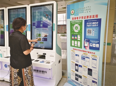 图为市民在医院门诊大厅用自助服务机刷医保电子凭证缴费。