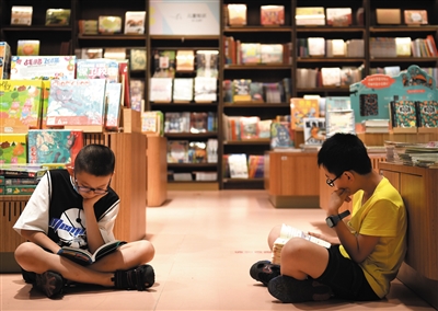 ◀7月12日,在西安市莲湖区一书店内,两名小朋友在阅读。