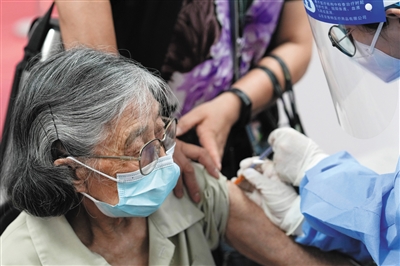 7月13日,在北京市朝阳区奥运村街道一处新冠疫苗接种点,医护人员为89岁的平女士接种新冠疫苗加强针。