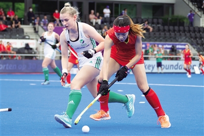 7月12日,在荷兰阿姆斯特丹举行的女子曲棍球世界杯比赛中,中国队以3∶1战胜爱尔兰队。图为中国队球员陈彦桦(右)与爱尔兰队球员哈米尔在比赛中拼抢。