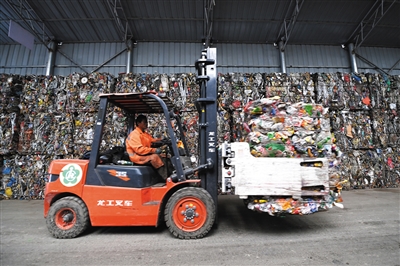 ▲7月18日,在玉树市净洁助残垃圾分类厂,工作人员转运可回收利用的塑料制品。