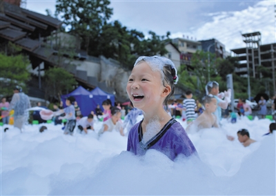 ▲7月20日,小朋友在戏水纳凉游乐区的泡泡池里嬉戏。