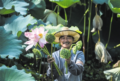 7月21日,东林镇泉心村的村民展示刚刚采摘的莲蓬与荷花。